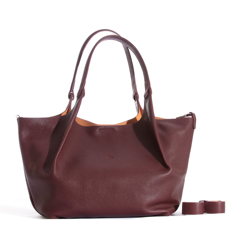 Rindledertasche außen bordeaux und Rindleder innen orange. Großes Handyfach innen. Die Tasche hat zwei stabile lange Lederhenkel, damit sie bequem über die Schulter getragen werden kann. Zu jeder Tasche ist ein individueller Schulterriemen kombinierbar.
